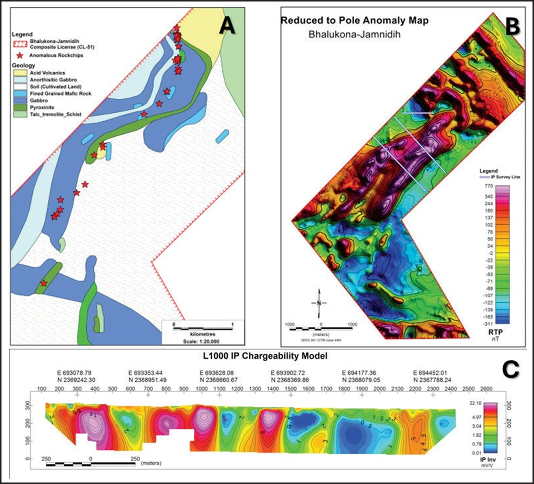 Disseminated sub-microscopic and microscopic chalcopyrite, pyrrhotite and pyrite sulphide grains are present in quartz-feldspathic veins, acid volcanic rocks, gabbro, pyroxenite and metapelite schist.