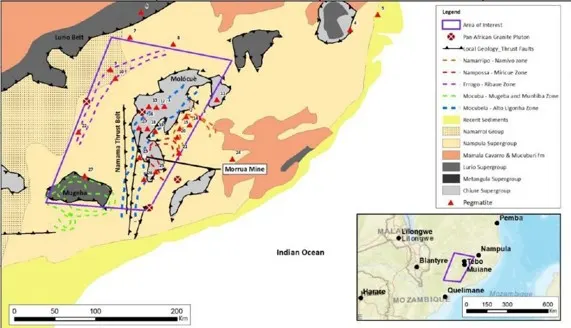 All our lithium and tantalum tenements are in the highly prospective Alto Ligonha pegmatite province in Zambezia Province. The Alto Ligonha pegmatite province encompasses almost every pegmatite in Mozambique (Figure 12). The region is famous for its gemstones and rare element metals such as beryllium, tantalum, and niobium. The region contains several modest-scale mines including the Morrua Tantalum mine near our Macuba prospect.