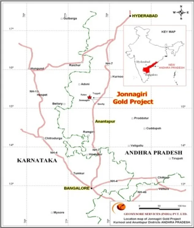 The Jonnagiri ML is located near the Jonnagiri, Erragudi and Pagadirayi villages within the Tuggali Mandalam in the Kurnool District of Andhra Pradesh. The Jonnagiri village lies on the Gooty–Pattikonda State Highway. The nearest town is Gooty, which is located on the Hyderabad– Bangalore National Highway No.7 and situated 250km north of Bangalore. The nearest railway station is at Pagadirayi which is the broad-gauge line of South-Central Railways. Gooty Railway Station is situated on the Chennai-Guntakal broad gauge line. Geomysore has a granted ML covering 597.82ha (1,477.24 acres), the center of which is situated at about 3.0km northeast of Jonnagiri Village. The Project is located in an area which is known for ancient gold and copper mining activity.