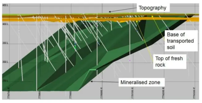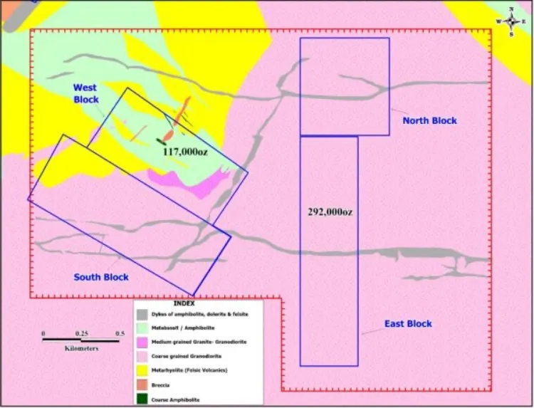 Geology of the East block is constructed based on these few outcrops and drill hole data. The average surface elevation of the East Block is 428m and is spread over an ancient artisanal working, which trends N-S and extends over 500m along strike with an average width of 40m.