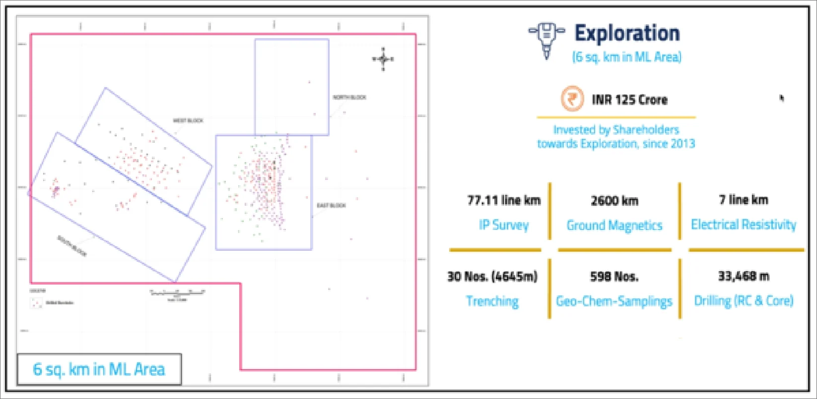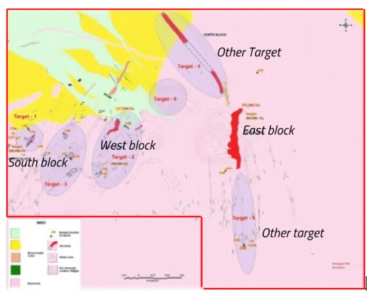 Gold mineralization in the ML area is distributed in 4 blocks, namely East, West, South and North Blocks. Geomysore has conducted detailed exploration in the East and West Blocks, to prove 361,000 ounces of Mineral Resource (JORC Indicated and Inferred categories), out of which approximately 271,000 ounces is open pittable. The optimized open pit of the East Block, which was done in the year 2017, contains about 150,000 ounces to a depth of 120m of Probable Mineral Reserve and Geomysore has pursued the detailed Economic Feasibility on this resource. The mine life based on 2017 pit optimization is about 7 years. Recent internal estimates show that the East Block open pit can be expanded to a depth of 180m which would contain 200,000 Oz of resource and increases the mine life to 10 years. In addition to the East Block, resources have been identified in the West block and South block, which can be further developed through detailed drilling. These resources could potentially increase the resource to 0.5MoZ and the mine life to about 15 years. The disposition of mineralized blocks within the ML area are shown above.